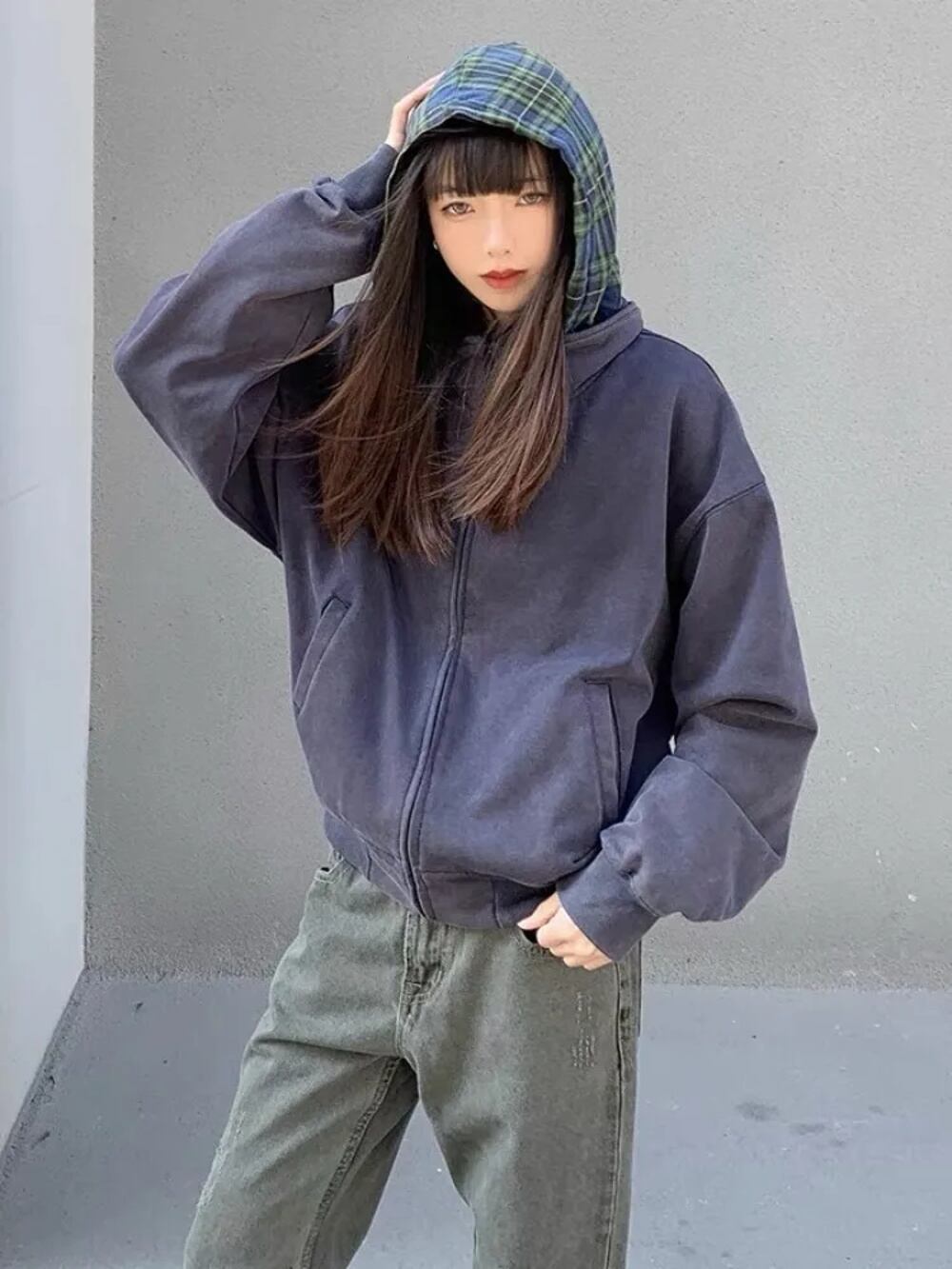 Deeptown-レディースヴィンテージプラドジップアップパーカー、アメリカンフーディー、y2kストリートウェア、フード付きスウェットシャツ、女性kpop、原宿長袖トップス T240926102015_01