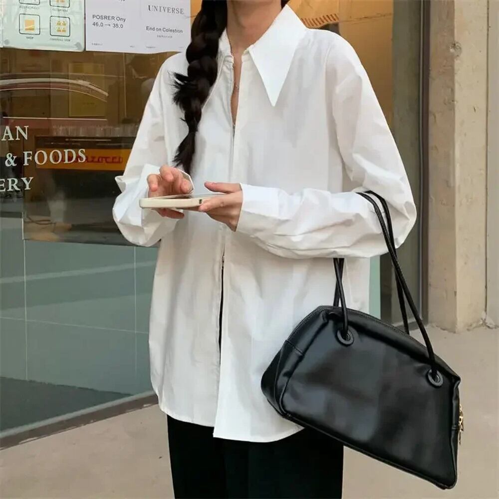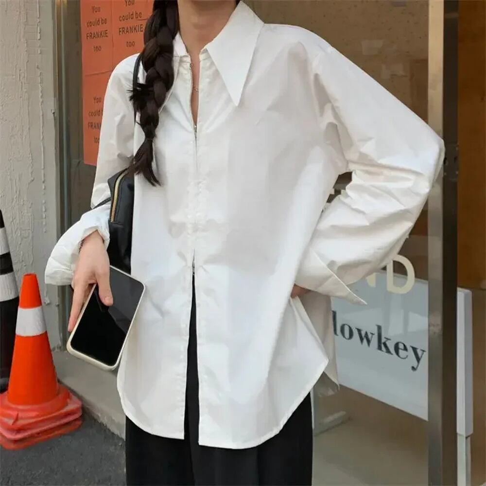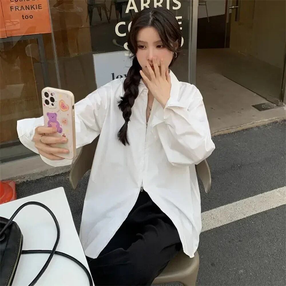 Deeptown-女性のカジュアルな原宿ブラウス,韓国のスタイル,特大のヴィンテージブラウス,非対称のトップ,女性のファッション,シックなジッパー T240926102046_01
