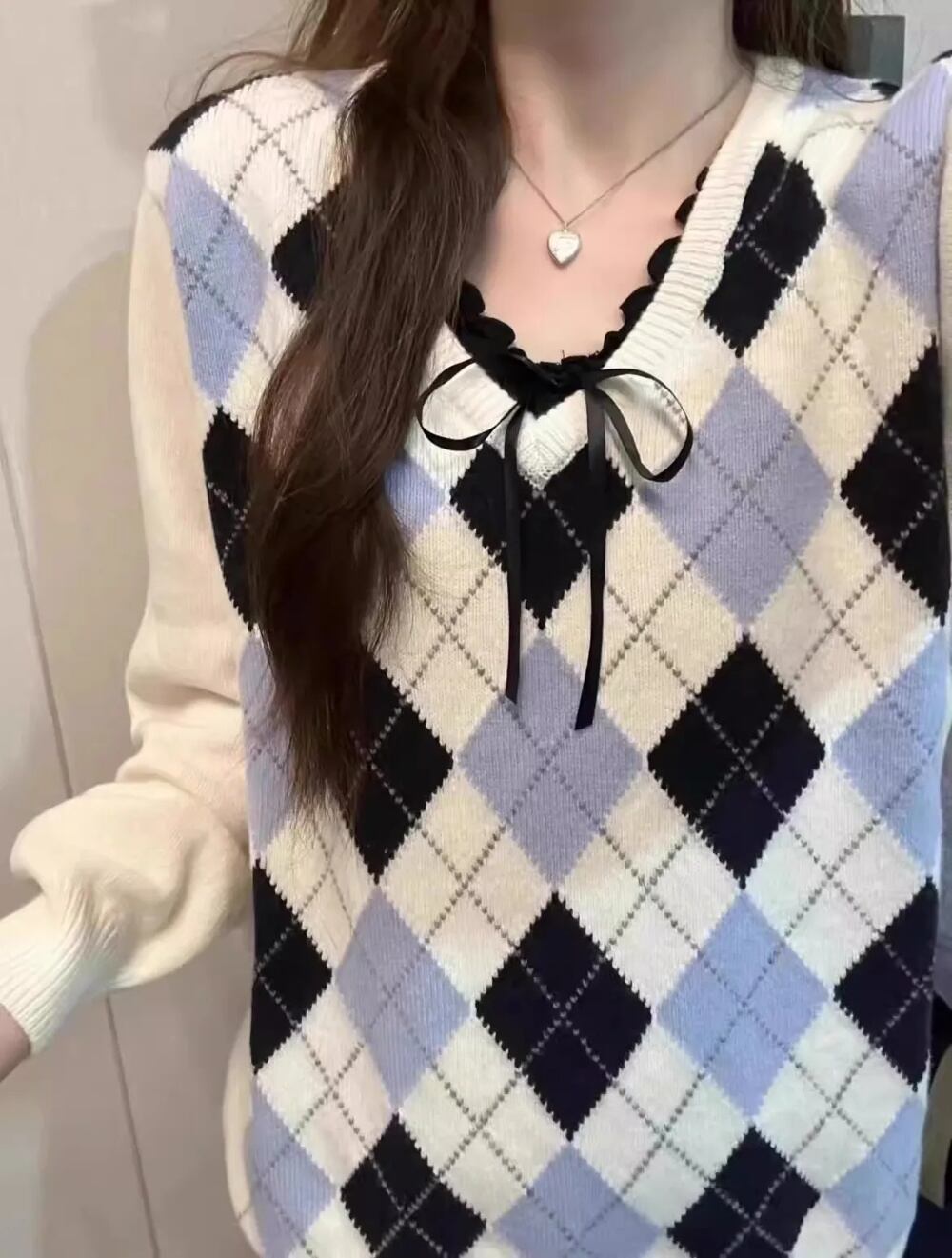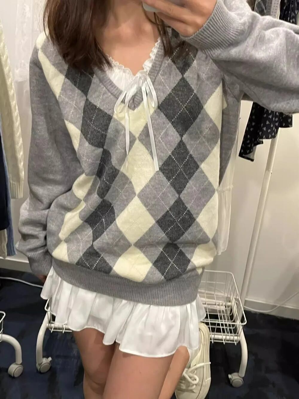 Deeptown-女性のヴィンテージアーギルニットセーター、アメリカンレトロプレッピースタイルジャンパー、カジュアルプルオーバー、長袖トップス、秋、冬 T240926102147_01