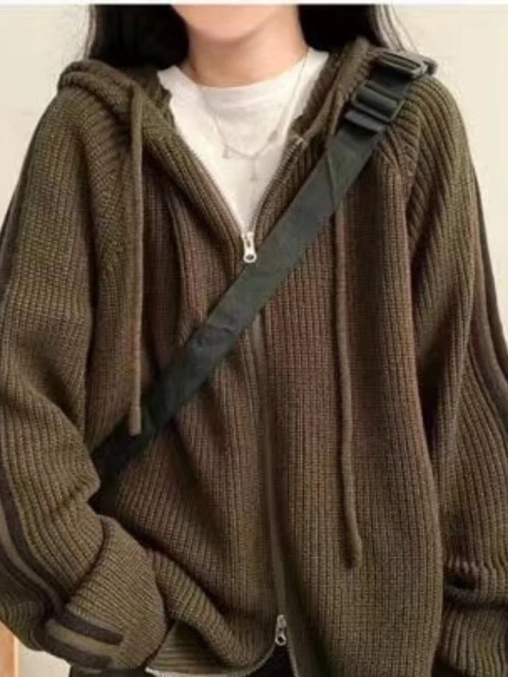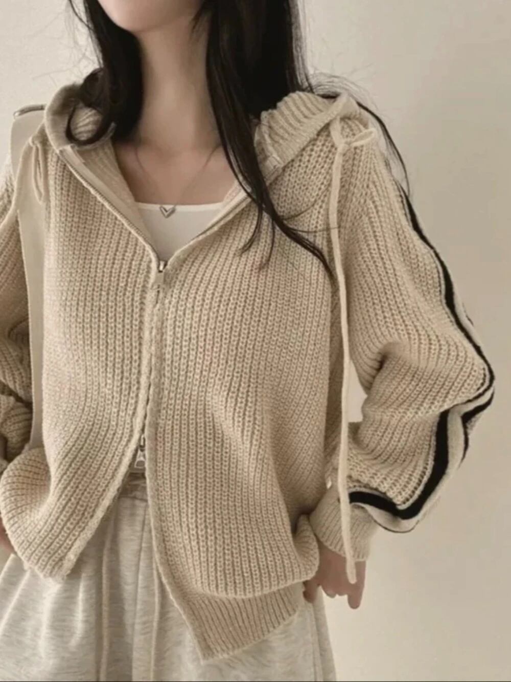 広州-女性のニットフード付きカーディガン、韓国スタイル、美的ストリートウェア、ストライプパッチワーク、ジッパーセーター、プレッピースタイル、y2k、2024 T240926102236_01