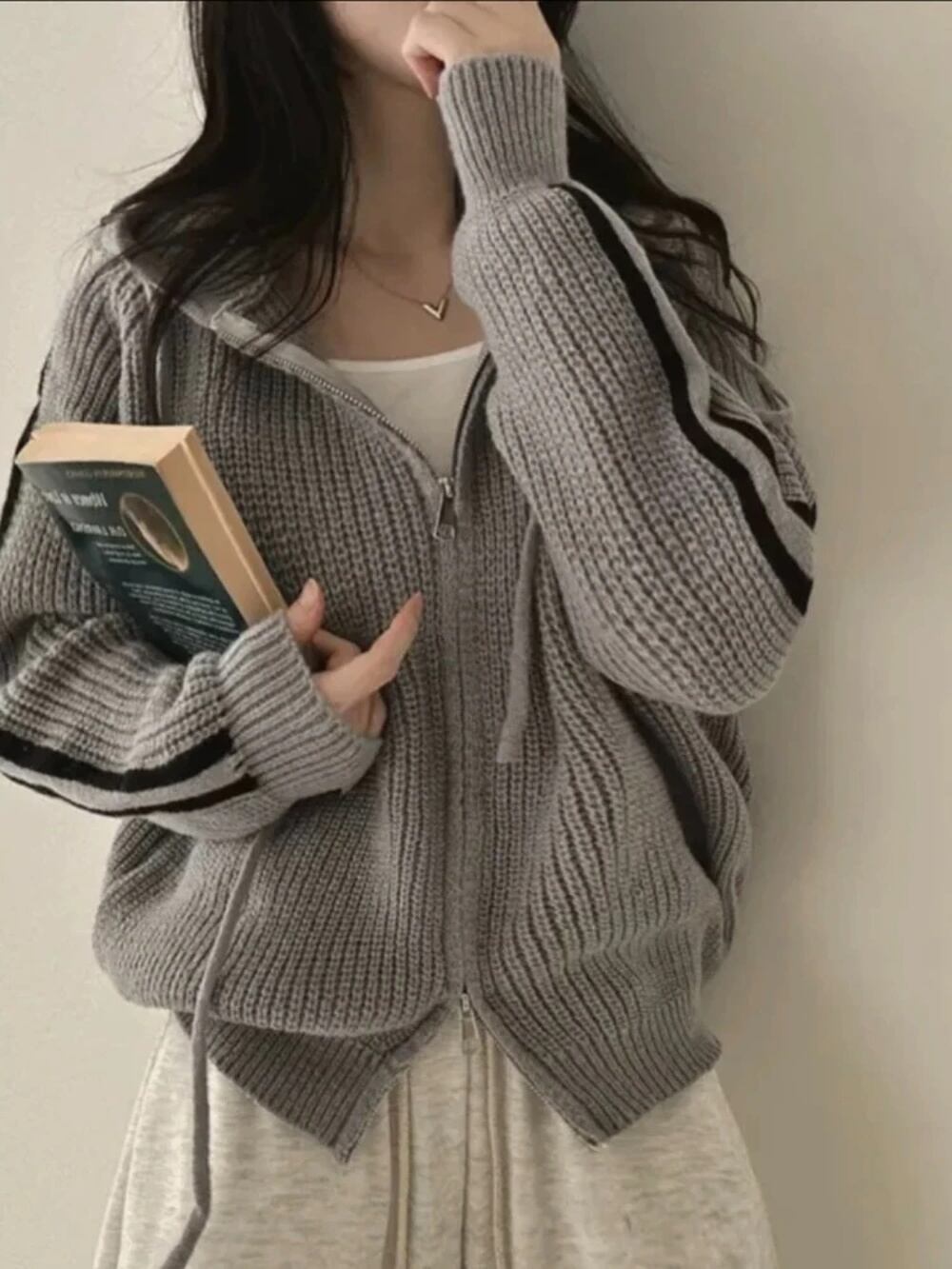 広州-女性のニットフード付きカーディガン、韓国スタイル、美的ストリートウェア、ストライプパッチワーク、ジッパーセーター、プレッピースタイル、y2k、2024 T240926102236_02