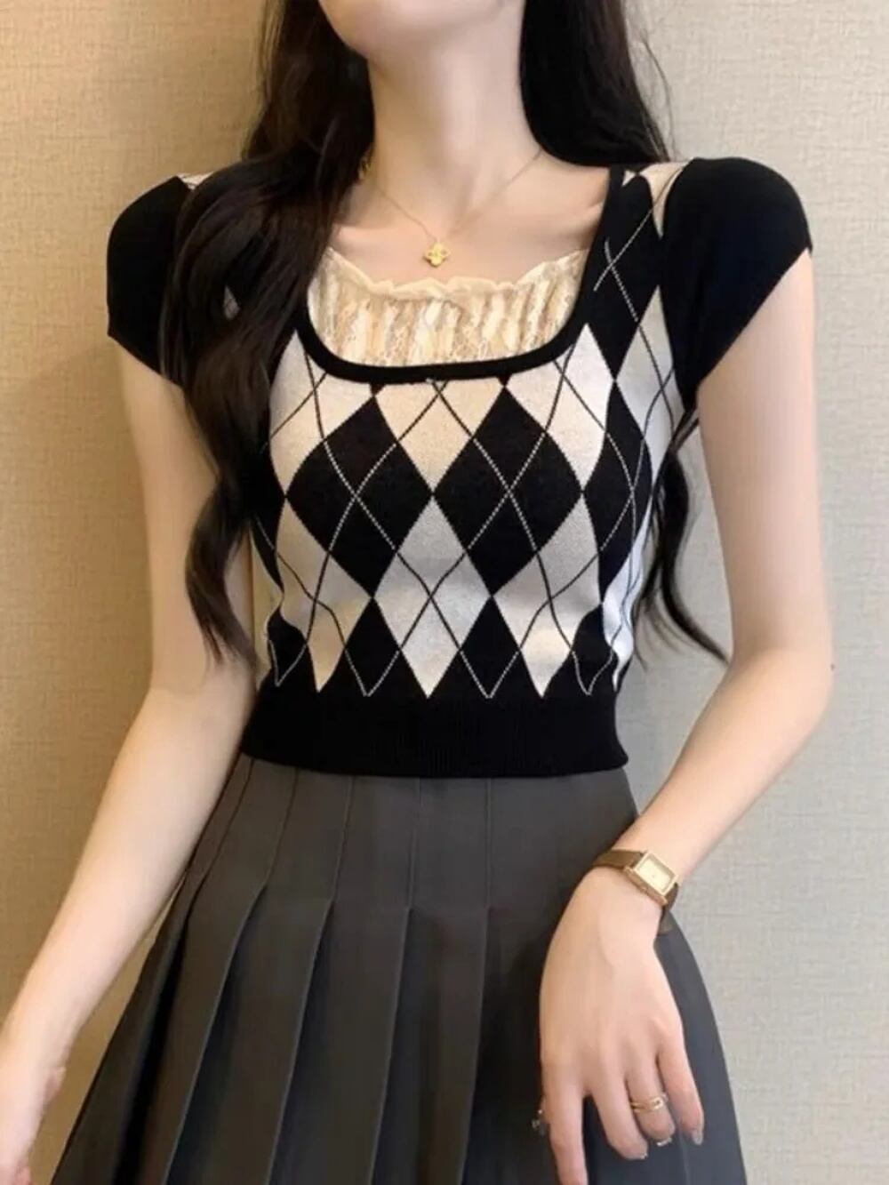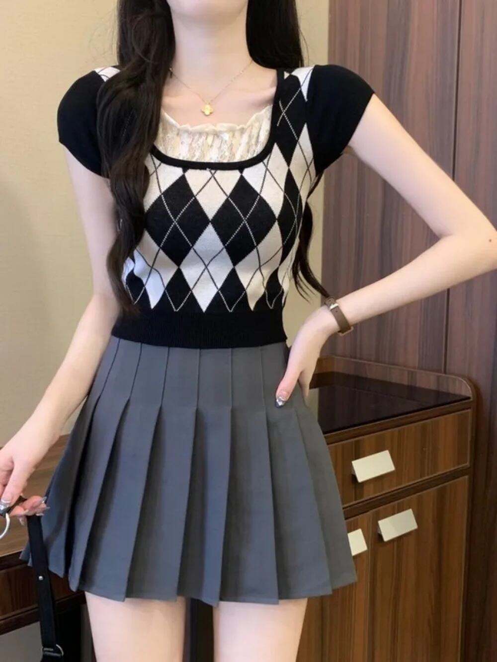 Deeptown-女性のレースのショートベスト,ヴィンテージセーター,美的,甘いニットセーター,韓国のファッション,kpopチェック柄のノースリーブトップ,コケット T240926102241_02