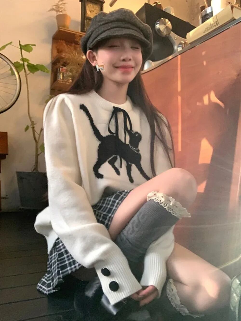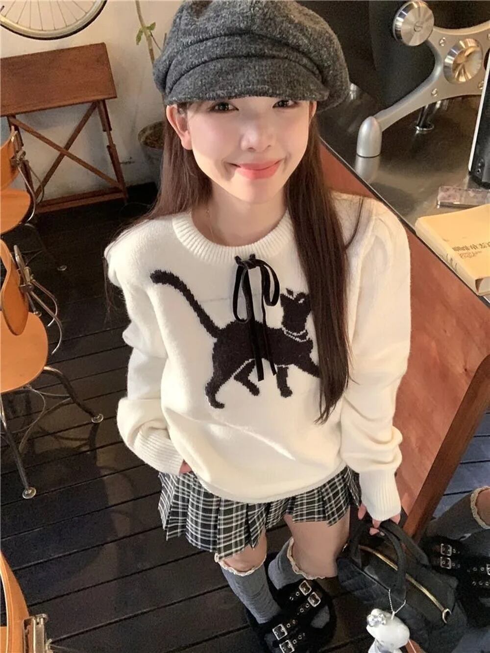 Deeptown-レディースカワイキャットグラフィックセーター、韓国ファッション、スウィートボウプルオーバー、kpopカジュアルトップ、長袖コート T240926102250_01