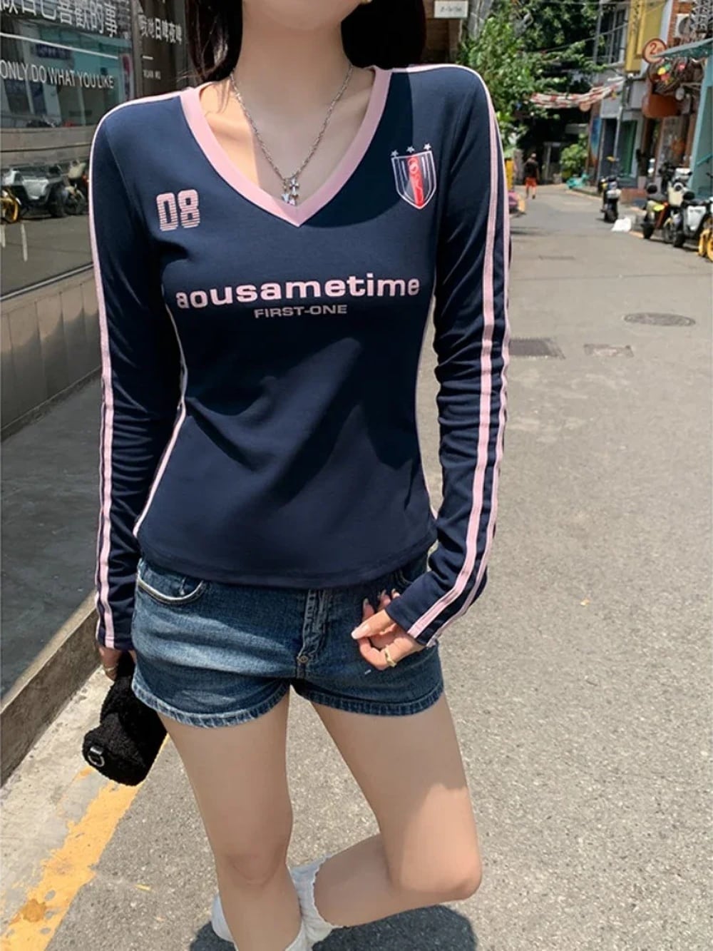 広州-女性のストライプパッチワークVネックスリムスウェットシャツ、原宿パーカー、美的ストリートウェア、アメリカンレトログランジ、シック、y2k,2024 T240926102458_03