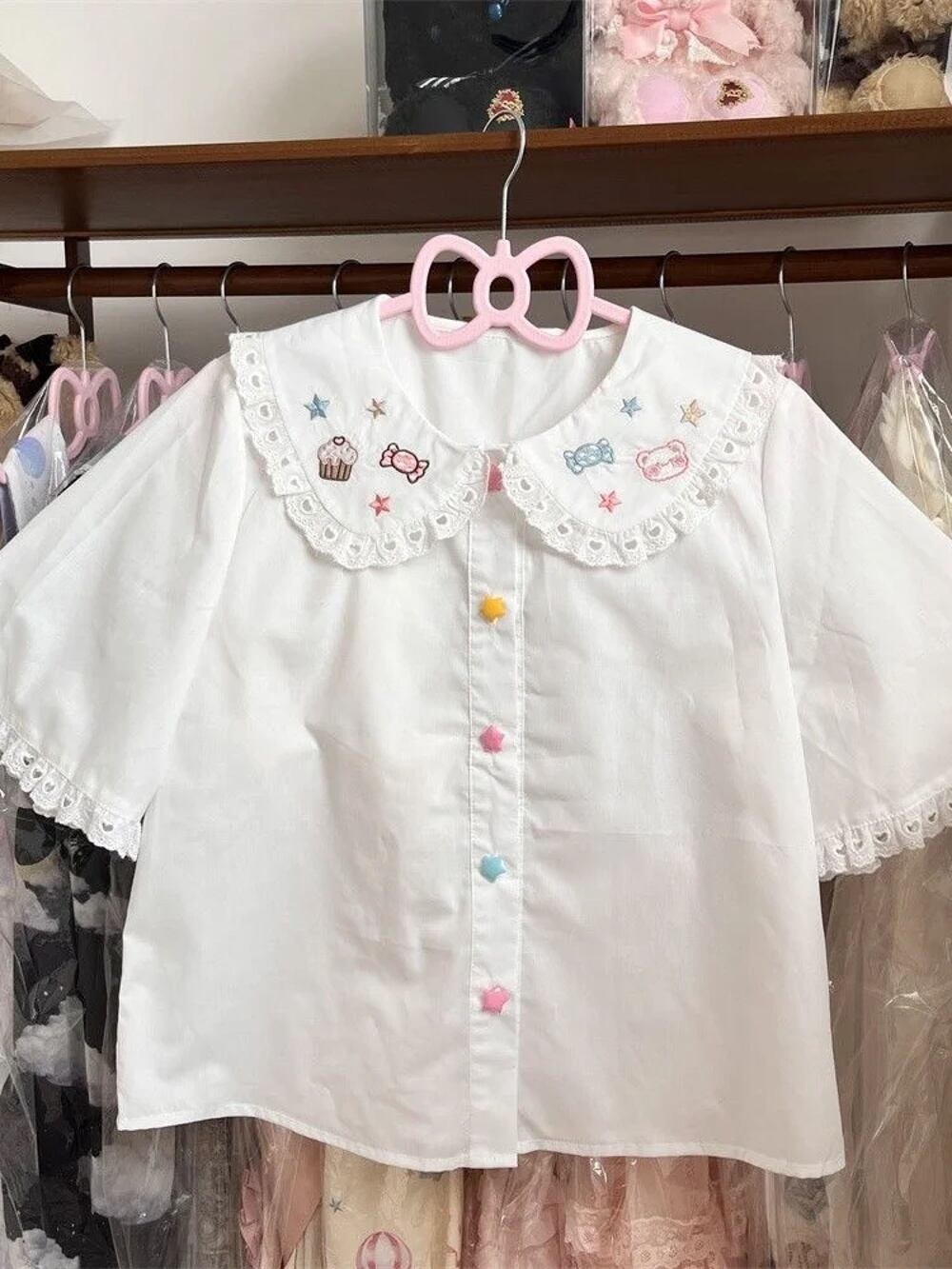 広州-女性のカワイイ原宿レースパッチワークシャツ、かわいい漫画の刺embroidery、柔らかい女の子のブラウス、和風、甘い、y2k,2024 T240926102526_01