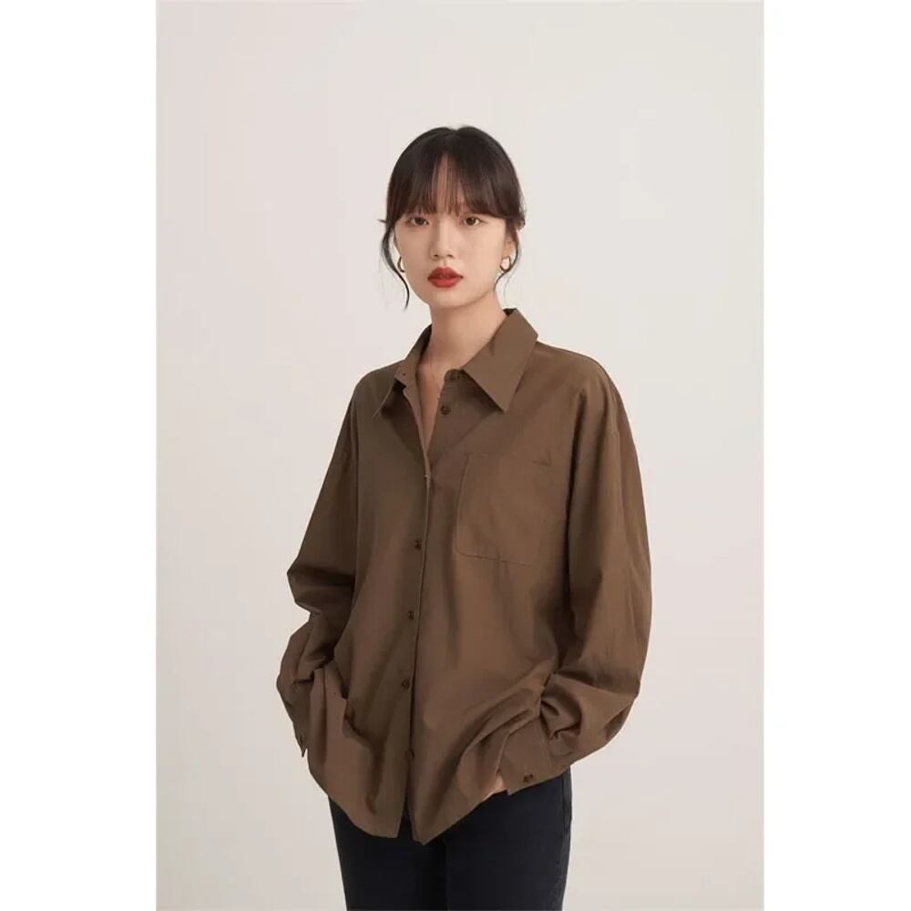 Deeptown-女性のヴィンテージブラウンシャツ、長袖ブラウス、オフィスウェア、エレガントな女性、カジュアル、韓国のファッション、ルーズ、秋 T240926102529_01