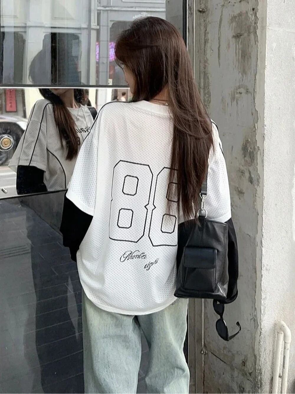 Deeptown-女性の特大スウェットシャツ、アメリカのヴィンテージy2kグラフィックフェイクツーピースジャージー、グランジヒップホップトップス、長袖ストリートウェア T240926102558_01