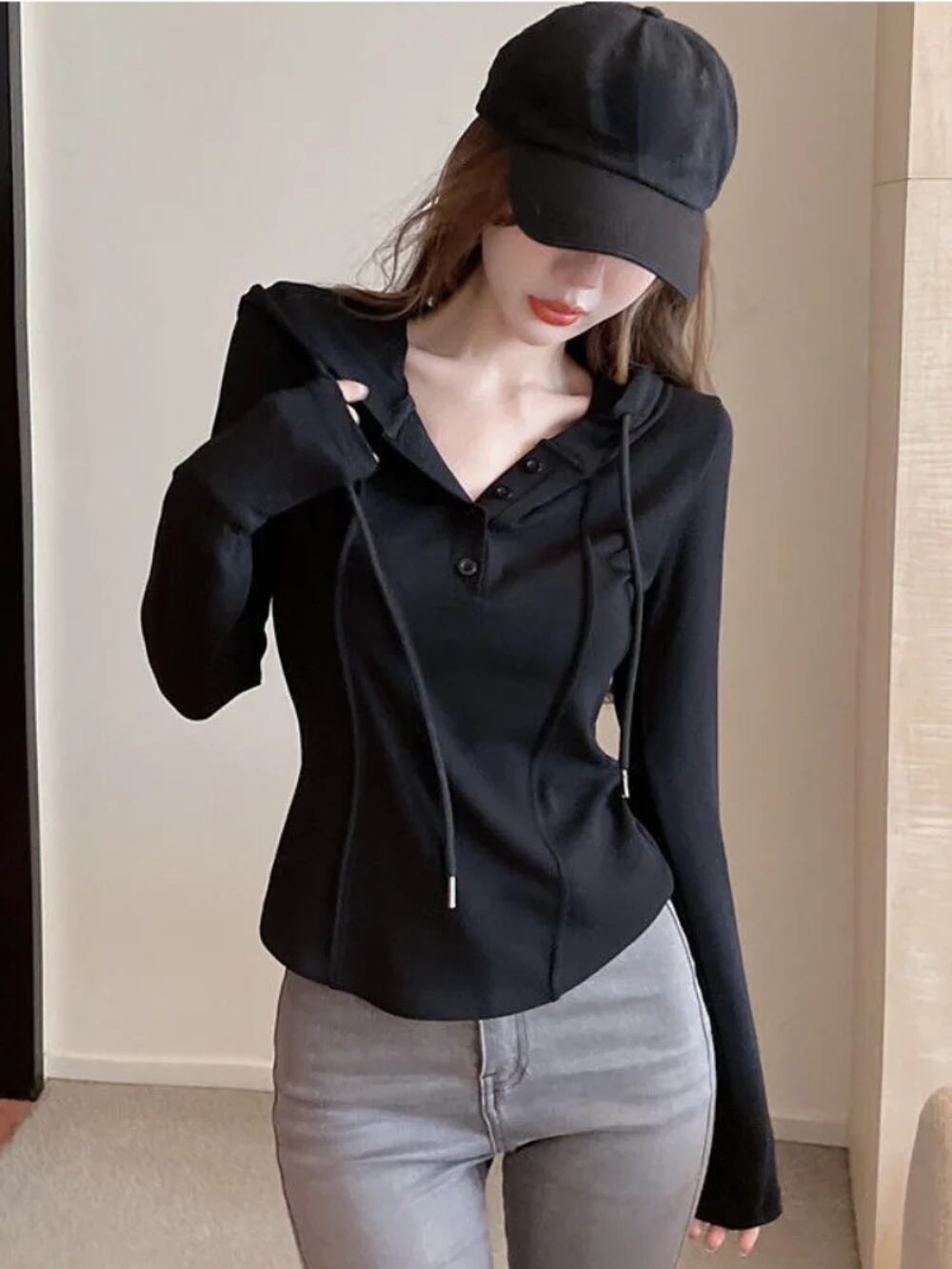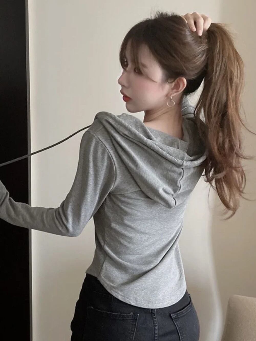 Deeptown-女性用ショートフーディ,韓国スタイル,スリム,プルオーバー,kpop,無地,フード付き,白い長袖,秋のファッション,2022 T240926102749_02