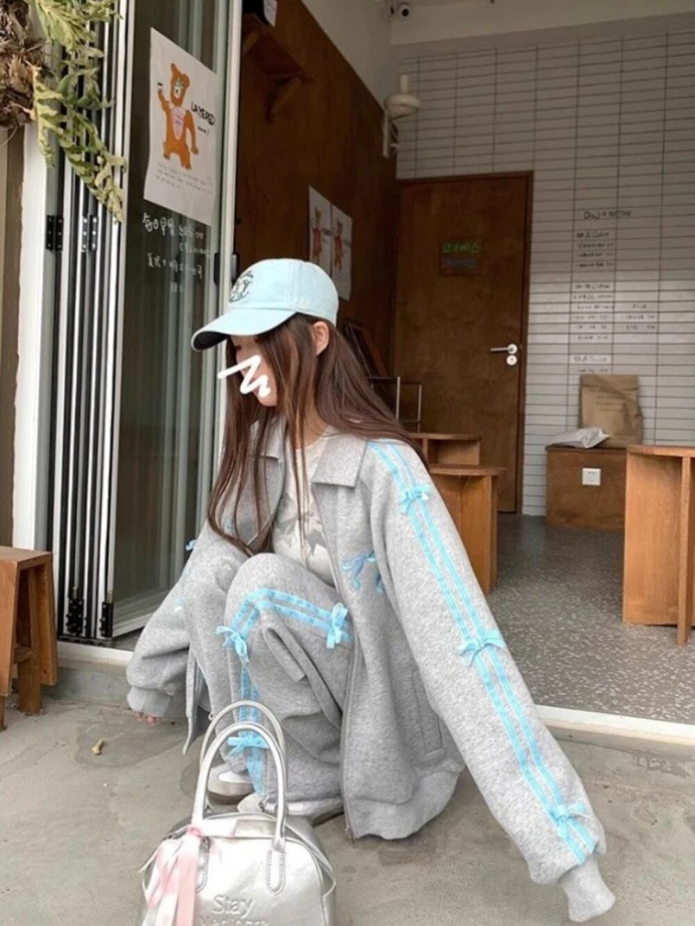 広州-レディースy2k原宿2ピースフード付きストリートウェア、韓国スタイル、かわいいストライプパッチワーク、弓刺embroidery、フード付きツーピーススーツ、2024 T240926103007_03