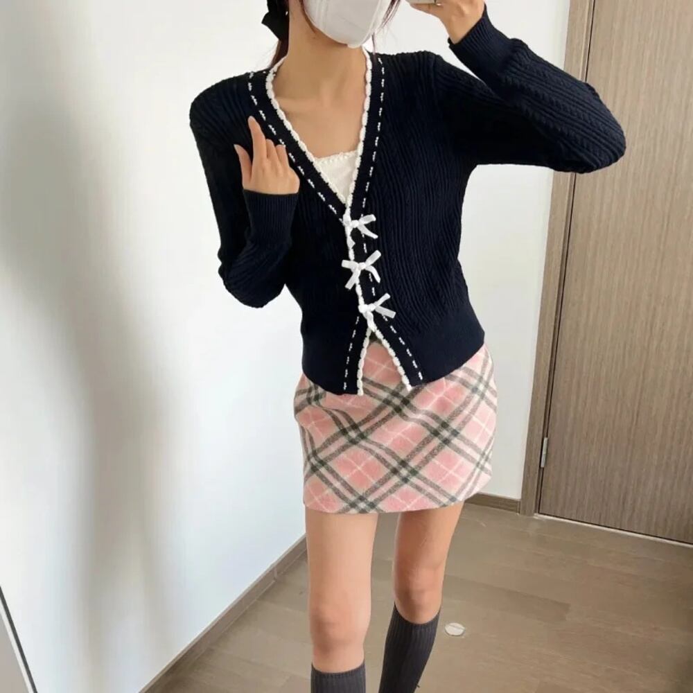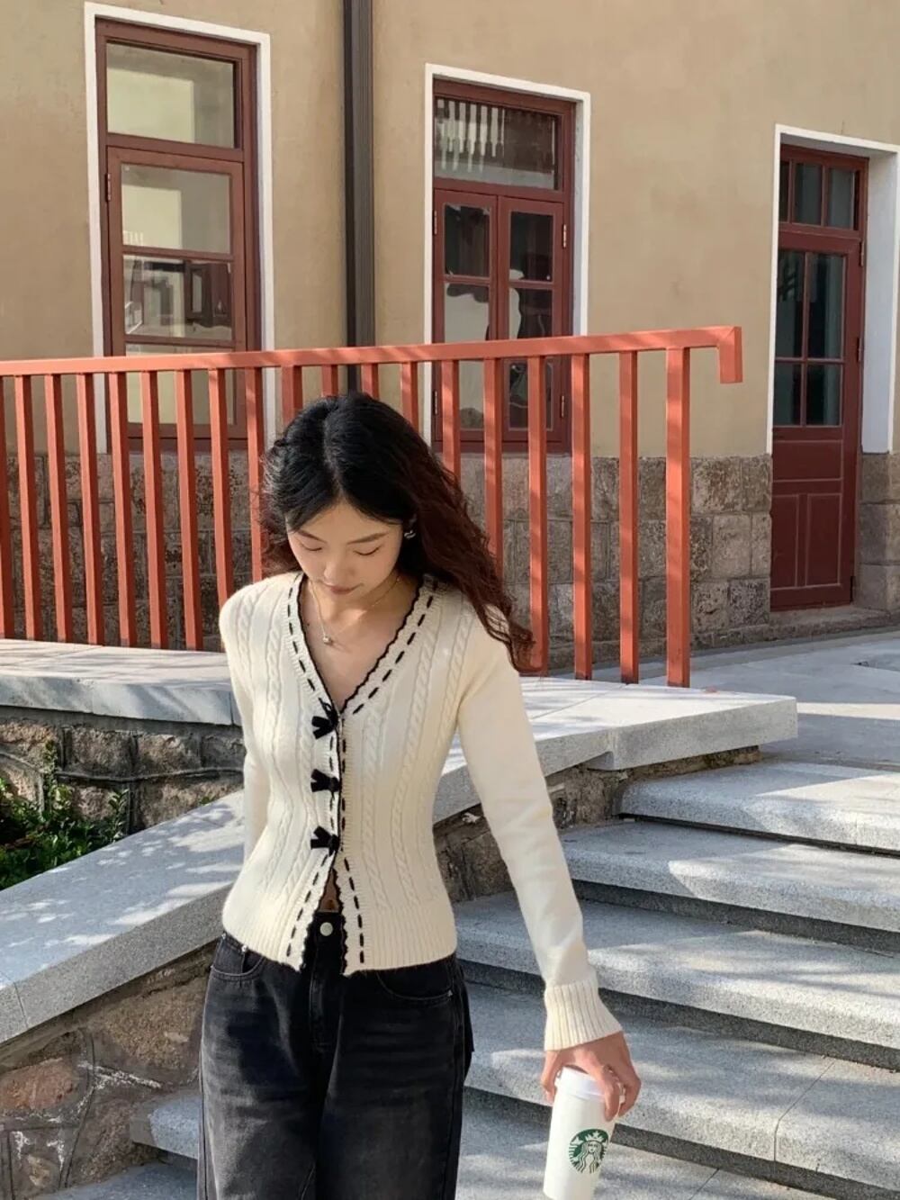 広州-レディースヴィンテージニットカーディガン,Vネックセーター,シックなセーター,パッチワークボウ,韓国スタイル,原宿,セクシー,シック,y2k,秋,2024 T240926103054_01