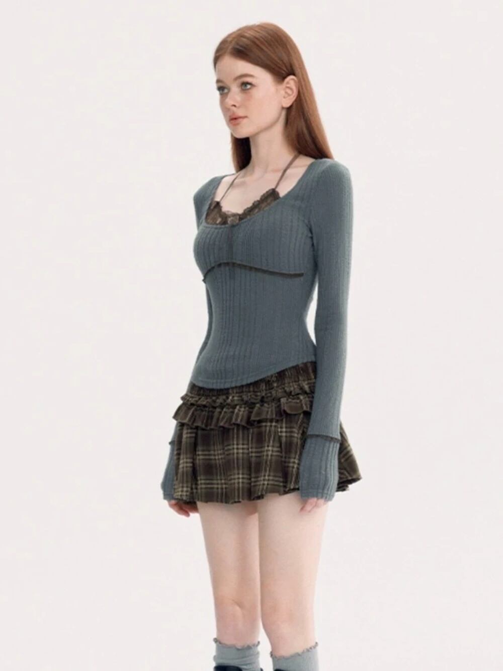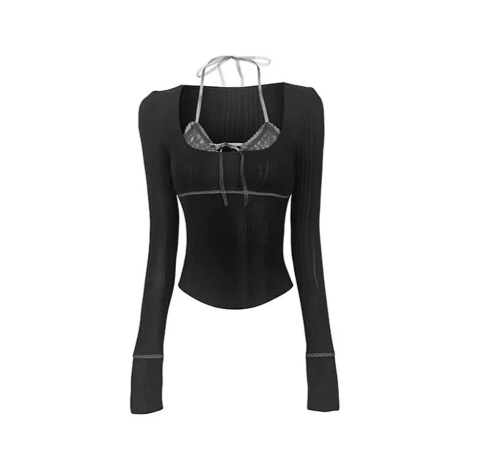 広州-女性用ニットプルオーバー、モノクロスリムセーター、フェイクツーピース、アメリカレトロレースパッチワーク、セクシーコケットストリートウェア、2024 T240926103202_02