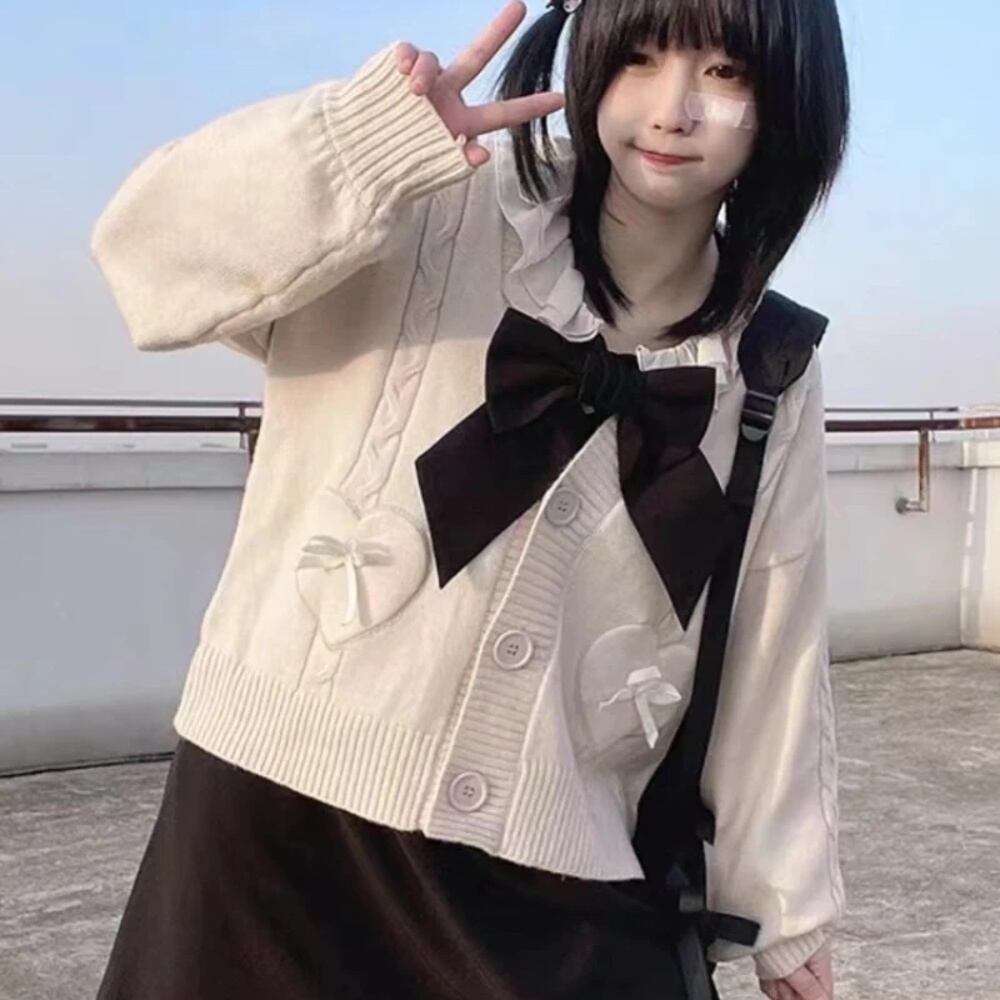 Houzhou-kawaii cuteoreプレッピースタイルニットカーディガン女性用、日本のjkプレッピースタイル、甘い弓Vネックセーター、ソフトガール、y2k、2024 T240926103303_03