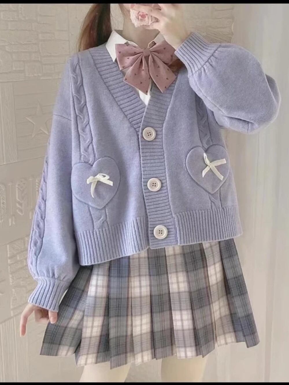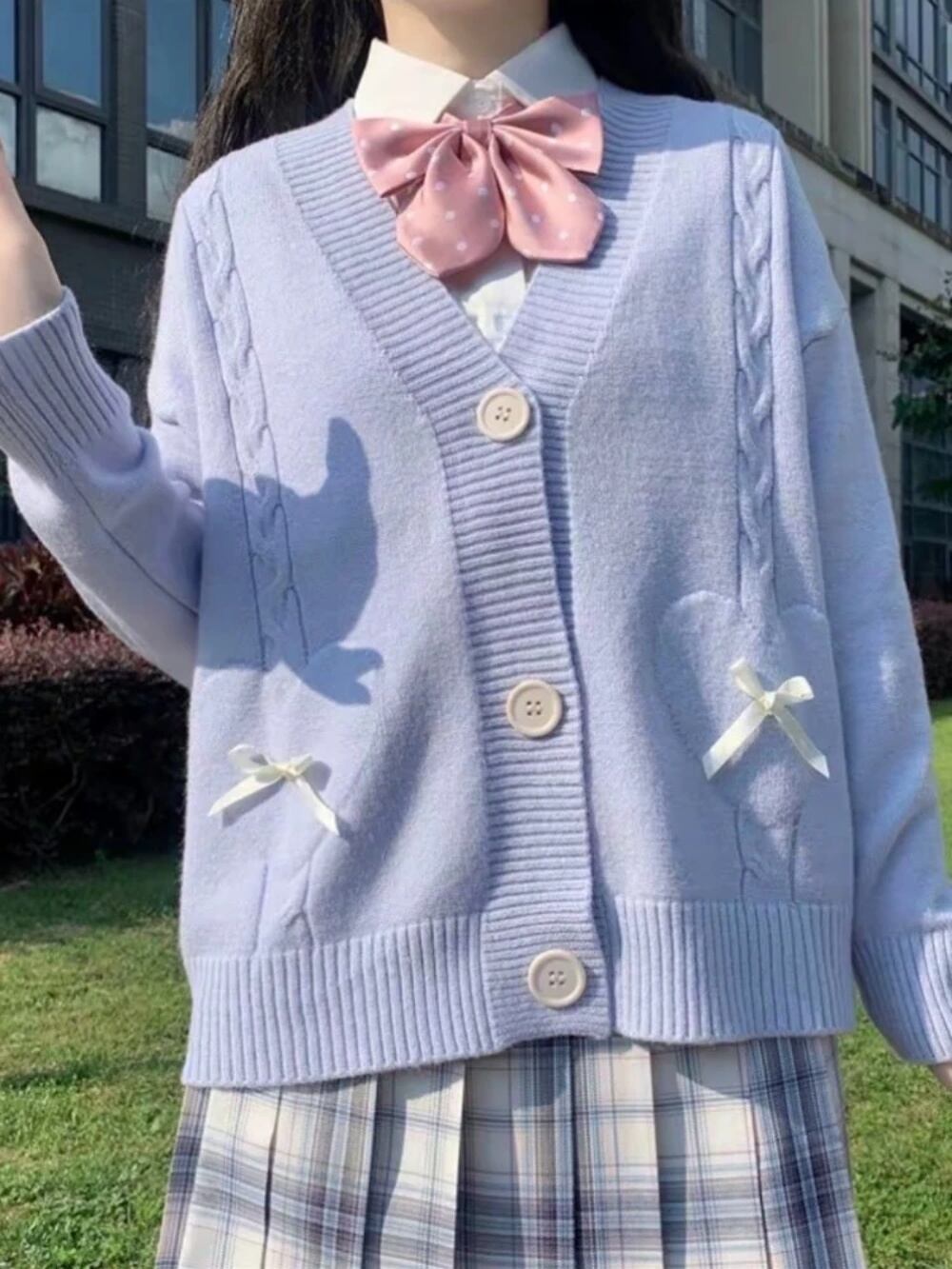 Houzhou-kawaii cuteoreプレッピースタイルニットカーディガン女性用、日本のjkプレッピースタイル、甘い弓Vネックセーター、ソフトガール、y2k、2024 T240926103303_04