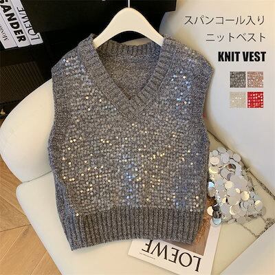 ニット ベスト レディース 秋冬 ニットベスト トップス キラキラ スパンコール ラメ Vネック プルオーバー レイヤード 重ね着 ゆったり 大きいサイズ ノースリーブ 秋 冬 グレー ミックスニット