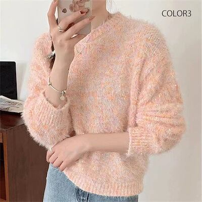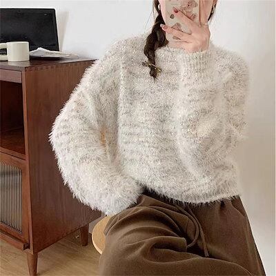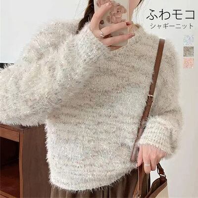 シャギーニットトップス レディース 秋 冬 トップス ニット セーター ニットトップス プルオーバー シャギーニット 長袖 起毛 クロップド丈 オーバーサイズ 体型カバー ゆったり クルーネック レイ