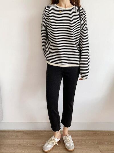 パイピング ボーダー カットソー 春 トレーナー パーカー レディース 秋 長袖 スウェット Tシャツ レディース カットソー 春 秋 ストライプ 長袖 体型カバー オーバーオール プルオーバー 韓国