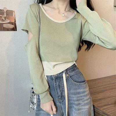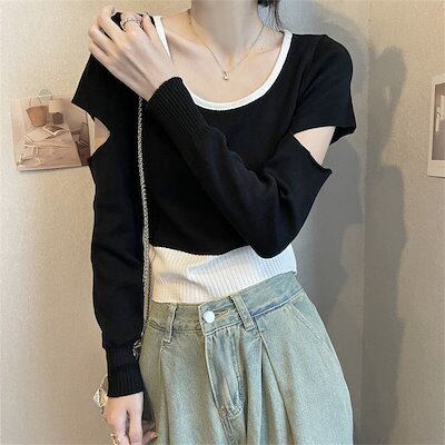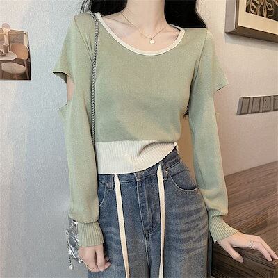 ニットセーター女性中空フェイクツーピーストップス 秋 パーカー 新作 2024