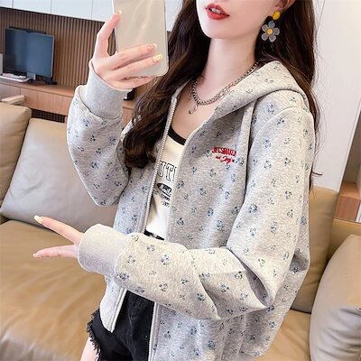 ルーズ ジップ スウェット フード付き トップス カーディガン クラッシュフラワー 韓国 カジュアル スウェットシャツ レディース パーカー ジャケット