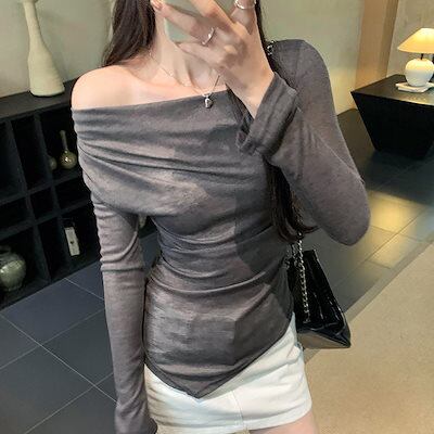 スリム ストラップレス トップス レディース 長袖Tシャツ 初秋 プリーツ ヴィンテージ ロンT パンプド
