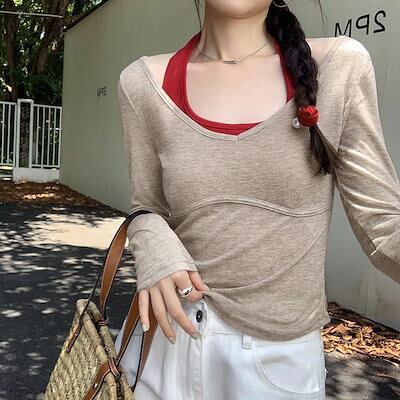ほんのり透ける ブラウス Vネック 秋 ロンT 吊りネック 新しいスタイル Tシャツ レディース