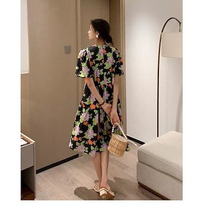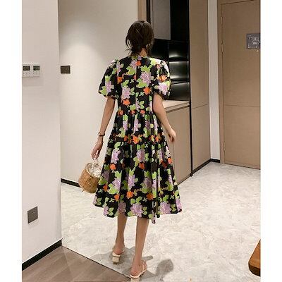 ワンピース レディース 40代 マキシワンピース 春夏新作 半袖ワンピース パフスリーブ 花柄Aラインスカート オシャレ韓国風 結婚式ドレス お出かけ ゆったり