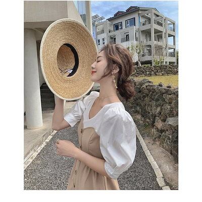 ワンピース レディース 40代 マキシワンピース 春夏 半袖ワンピース パフスリーブ 配色 aラインスカート 韓国風 オシャレ 体型カバー お出かけ 大人 上品