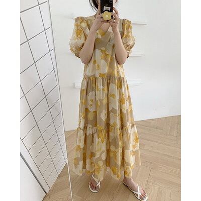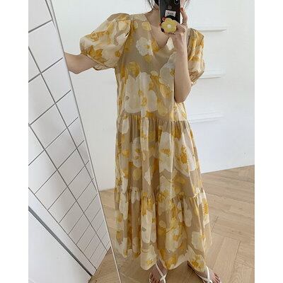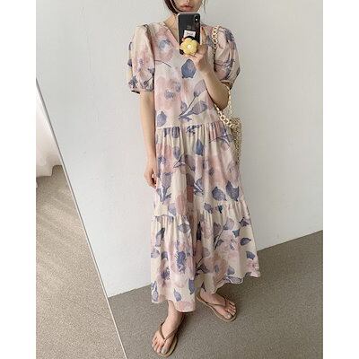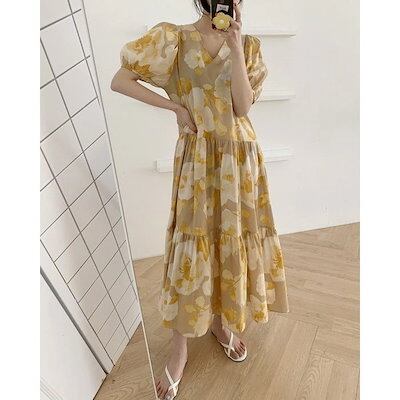 ワンピース レディース 40代 マキシワンピース 春夏 上品 半袖ワンピース 花柄 vネックワンピース パフスリーブ フレアスカート オシャレ 結婚式ドレス お出かけ