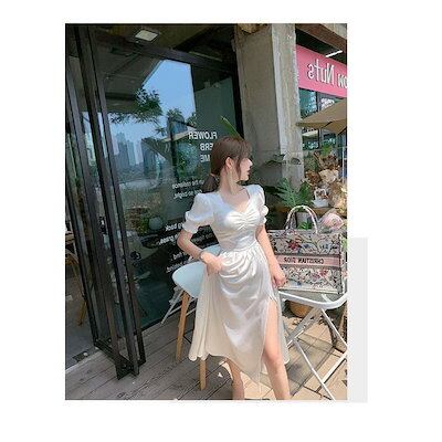 ワンピース レディース 40代 マキシワンピース 春夏新作 半袖ワンピース パフスリーブワンピース スリットスカート オシャレ韓国風 結婚式 お出かけ 30代50代
