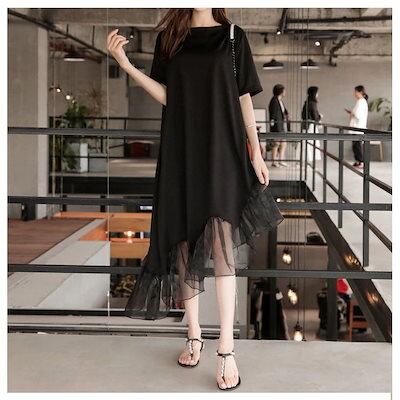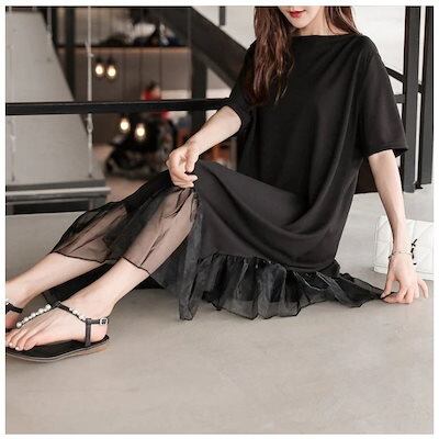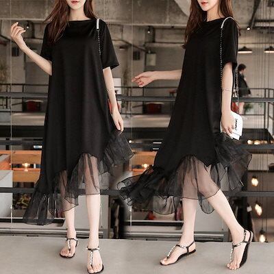 ワンピース レディース 40代 キレイめ マキシ丈ワンピース 春夏 半袖ワンピース 黒チュールフレアスカート ゆったり オシャレ大きいサイズ 着痩せ 30代 50代