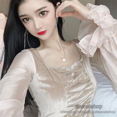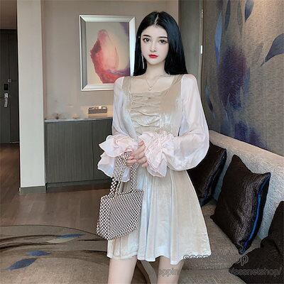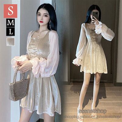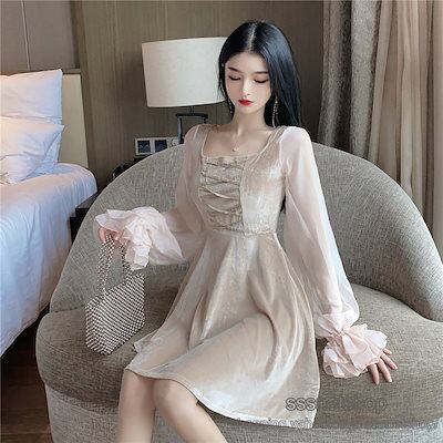 ワンピース ミニ丈 レディース スクエアネック 長袖 レトロ ベルベットワンピ 淑女 フェミニン ランタンスリーブ シフォン袖 着痩せ オシャレsssnetshop