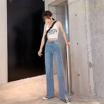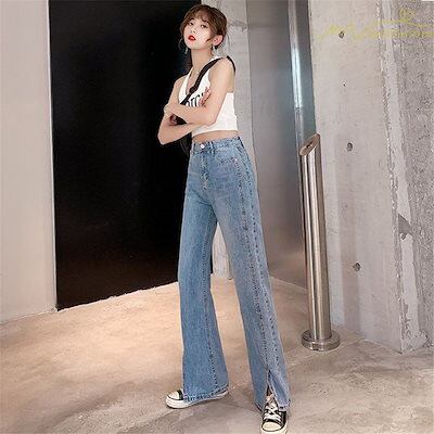 デニムパンツ マキシ丈パンツ ワイドパンツ ハイウエスト 着痩せ ガウチョパンツ ストレートパンツ デイリーコーデ 無地 スリットパンツ カジュアル ジーンズ