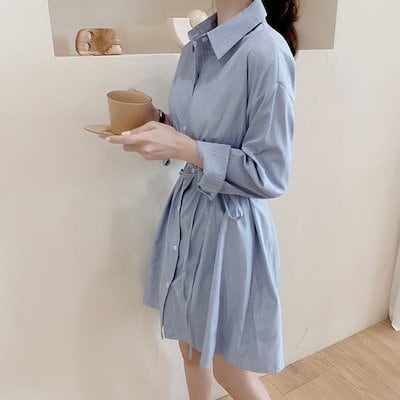 シャツワンピース レディース ワンピース ショート丈 シャツワンピ ストライプ 長袖 ワンピ おしゃれ ブルー ベスト付き きれいめ ゆったり