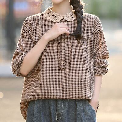 シャツ レディース シャツブラウス かわいい レース丸襟 ブラウス 長袖 冬 トップス 綿 カジュアル シャツ レディース 長袖 秋冬 秋トップス 長袖シャツ チェック 切り替え ギャザー 大きいサ