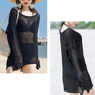 Tシャツ トップス レディース 水着の上から 長袖 クロシェ編み ニット オーバー 体型カバー