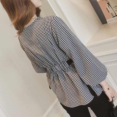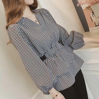 ギンガムチェックブラウス Vネック チェック柄 ギンガムチェック トップス プルオーバー Aライン シャツ ブラウス 長袖 シンプル かわいい レディ