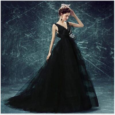パーティードレス ウェディングドレス 花嫁大きいサイズ フォーマルドレス ロングドレス セクシー黒Vネック チュールドレスイブニングドレス司会者結婚式披露宴