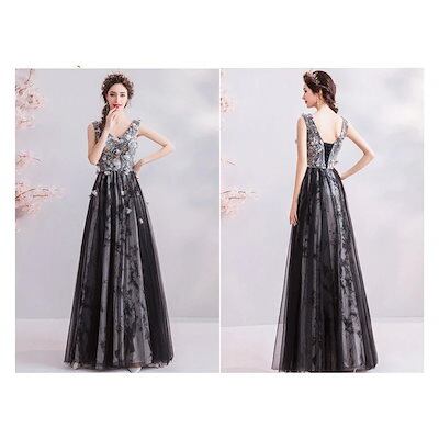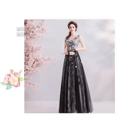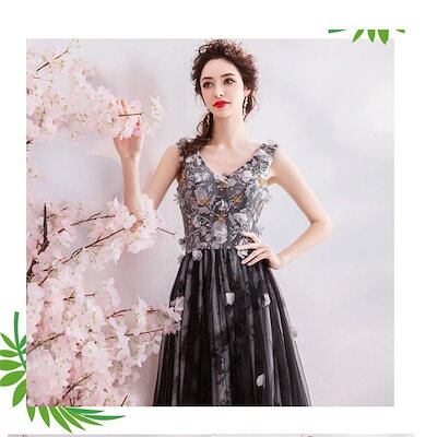 ドレス パーティードレスウェディングドレス花嫁小さいサイズロングドレス花びら飾り墨色レディースエレガント結婚式二次会披露宴お呼ばれドレスXSXXXL