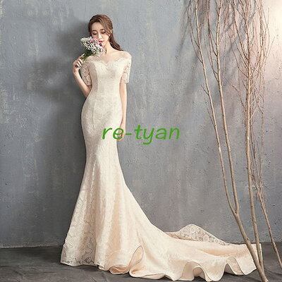 ウェディングドレス 大きいサイズ マーメイド 袖あり 白二次会花嫁 フィッシュテール オフショルダー 総レース トレーンロングドレス エレガント 上品マキシ丈