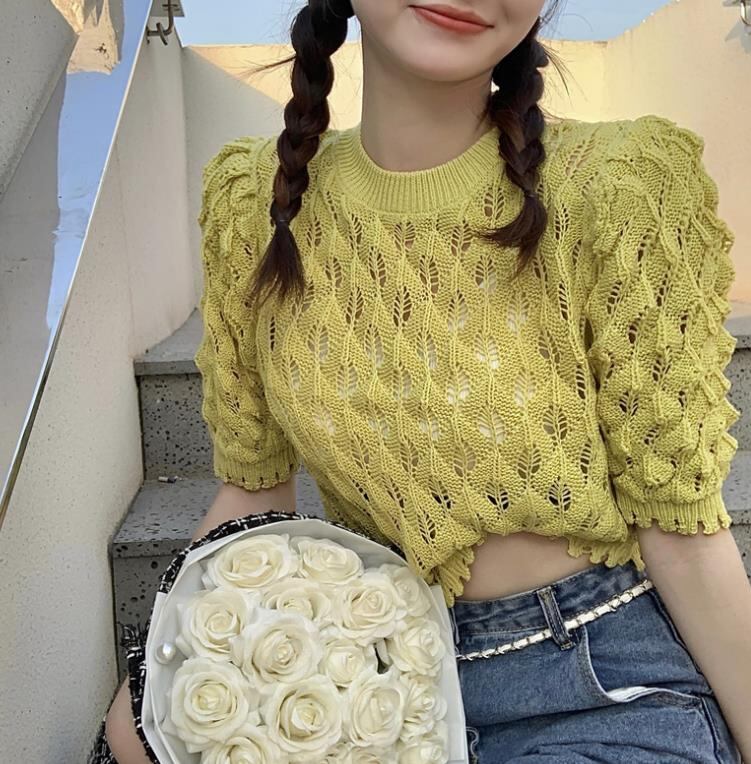 2022春夏新作 レディース 女 半袖 ニット トップス Tシャツ インナー カットソー 2色