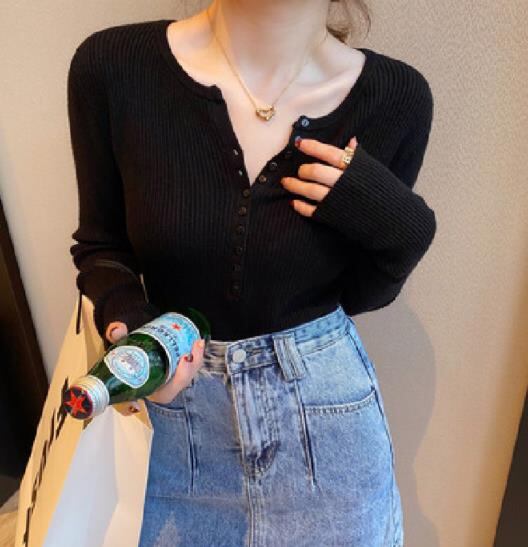 2022春夏新作 レディース 女 長袖 無地 ニット 毛糸 Vネック トップス Tシャツ インナー カットソー 11色
