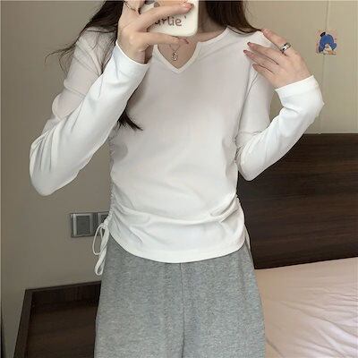 新作 かわいい 長袖 Vネック Tシャツ 百掛け スウエット 柔らかい OL 通勤 オフィス フリルネック 着痩せ Tシャツ 大きめサイズ Tシャツ