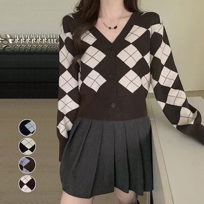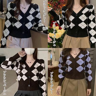 アーガイル柄 ニットカーディガン レトロ ニットカーディガン レディース アウター 秋冬 新作 ミディアム丈 羽織り ゆったり