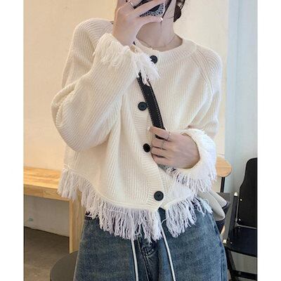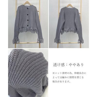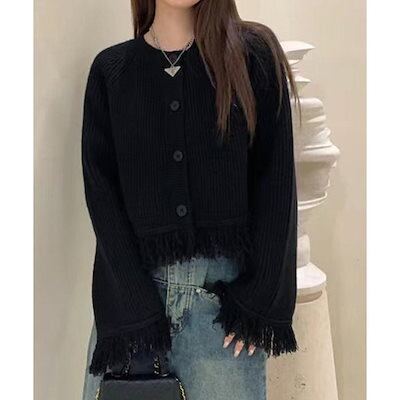 フリンジニットカーディガン クルーネック ニットカーディガン レディース アウター 秋冬 新作 ミディアム丈 羽織り ゆったり