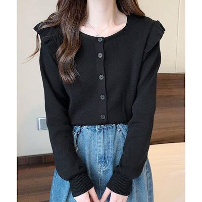 ニットカーディガン ショルダーフリル ニットカーディガン レディース アウター 秋冬 新作 ミディアム丈 羽織り ゆったり