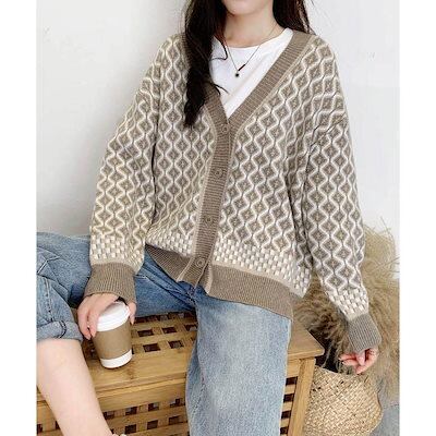 ジャガード編みニットカーディガンVネック ニットカーディガン レディース アウター 秋冬 新作 ミディアム丈 羽織り ゆったり