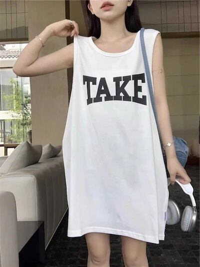 ヘビロテ!キャミワンピース ミニ丈 ゆったり ノースリーブ ラウンドネック Aライン 英語 プリント かわいい カジュアル おしゃれ 夏 韓国ファッション レディース お出かけ