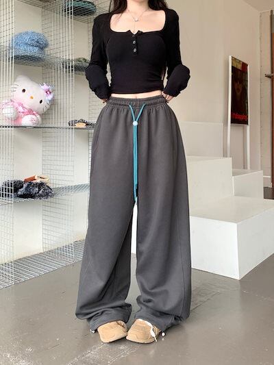 パンツ ロング丈 スウェット ワイド ストレート ウエストゴム ハイウエスト 美脚効果 脚長効果 細見え 秋 赤 白 黒 黄色 おしゃれ かわいい 韓国ファッション レディース お出かけ