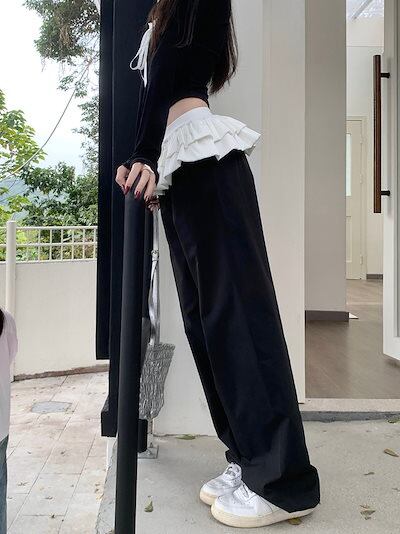 2024秋冬 パンツロング丈ストレート レッグパンツウエストゴム ハイウエストゆったり 脚長効果美脚効果細見え春カジュアル 黒韓国系ファッションレディースサイドお出かけおしゃれ かわいい衣装 トラック