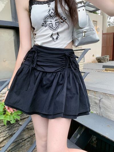 2024秋冬 スカート ミニ丈 ハイウエスト 脚長効果 美脚効果 細見え かわいい風 おしゃれ キュート フレンチ 甘め カジュアル 春 黒 サイド白 韓国系ファッション レディース お出かけ
