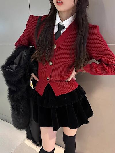 2024秋冬 Vネック 4色 甘め ニットネクタイ付き トップス ミニ丈 ショートセーター レディースファッション系 jk 秋冬 春 学生 高校生ストライプカーディガンジャンパー高生 フレンチ